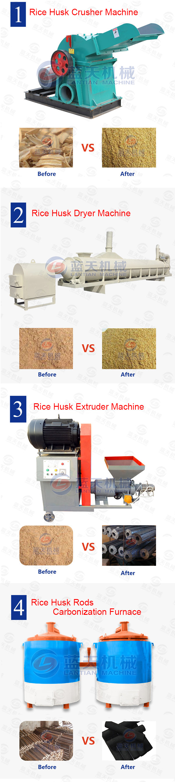 After rice husk was dried, they can briquette by many Lantian Brand briquette machine, one of is rice husk extruder machine, materials can extrude material into rice husk rods, and finished products have high density and high strength. We are rice husk extruder supplier, we focus on developing environmental production machine, our machine have just price and excellent performance, it is very loved in many countries.