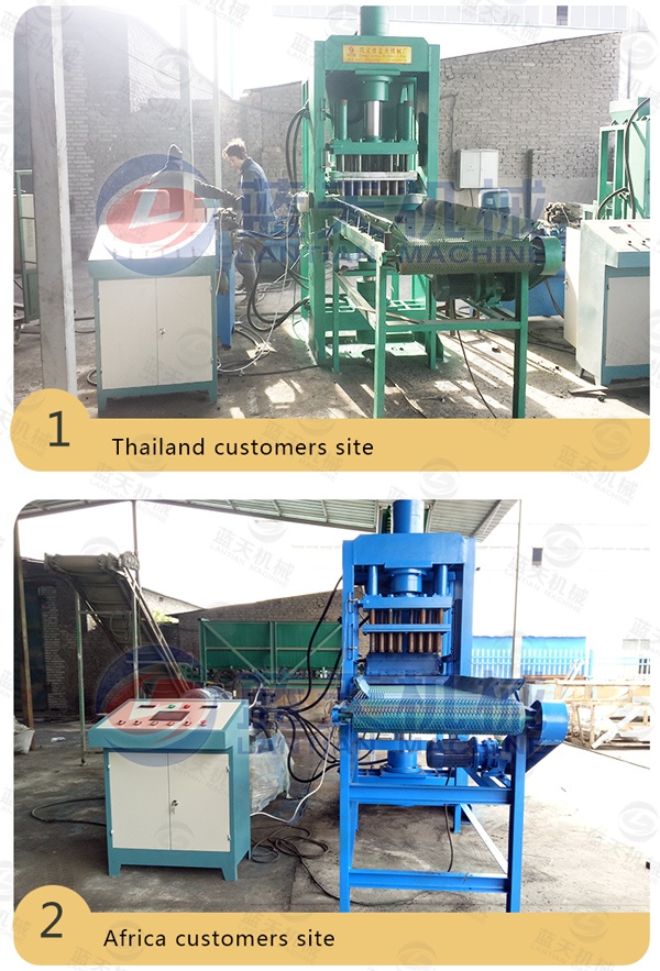 When coconut shisha charcoal press machine is working, it adopts Pascal's principle, after sensor was switched, the pretreated charcoal powder are transferred to the die, and materials are pressed by hydraulic pump under high pressure. Our machine is controlled by the PLC intelligent control system, and pressure can be adjust between 100-200t, the finished product has high strength, high density, high hardness and good burning effect, our Lantian Brand coconut shisha charcoal machine in Indonesia is very popular.